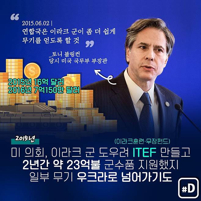 미 의회는 이슬람국가 사태가 심각해지자 이라크군과 쿠르드 페슈메르가, 수니파 민병대를 돕기 위해 2015년 이라크훈련·무장펀드(ITEF)를 조성해 그해 16억 달러, 이듬해 7억150만 달러의 예산을 배정해 개인화기를 비롯해 박격포, 탄약, 군용트럭·중장비, 무선통신 장비, 전투 헬멧, 전투화, 화생방 장비 등 다양한 무기와 군수품을 지원토록 했었습니다.