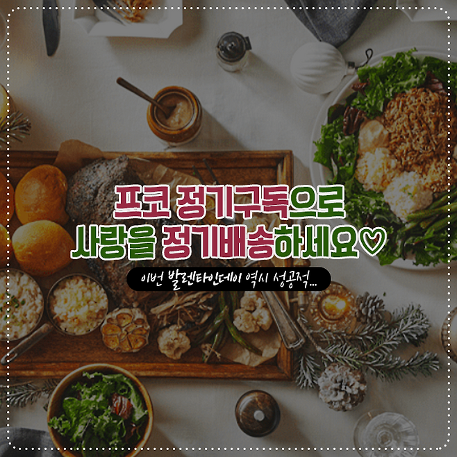 맛, 건강, 영양 3박자가 고루 갖추어진 프코 정기구독! 이번 발렌타인데이에는 뻔한 초콜릿 선물 대신 프코 정기구독권을 선물하며, 잊지 못할 발렌타인데이를 연출해 보는 것도 좋겠습니다.