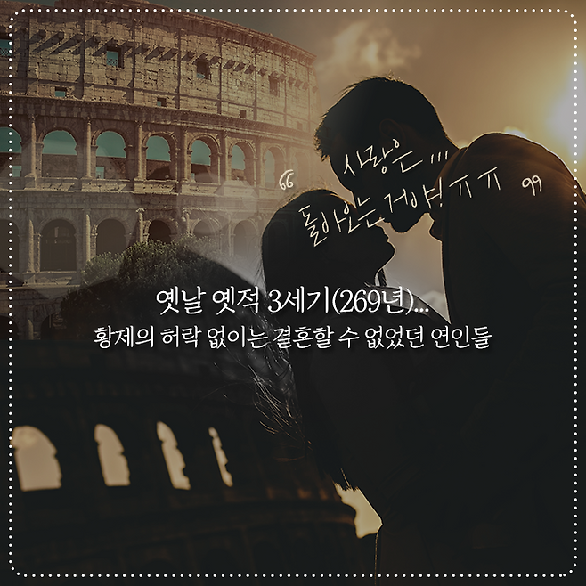발렌타인데이의 유래는 3세기(269년), 로마시대로 거슬러 올라갑니다. 당시, 남녀는 서로 아무리 사랑하더라도 황제의 허락이 있어야만 결혼할 수 있었다고 해요. 서로의 동의만 있으면 혼인신고가 가능한 오늘날과는 너무 다른 모습이죠.