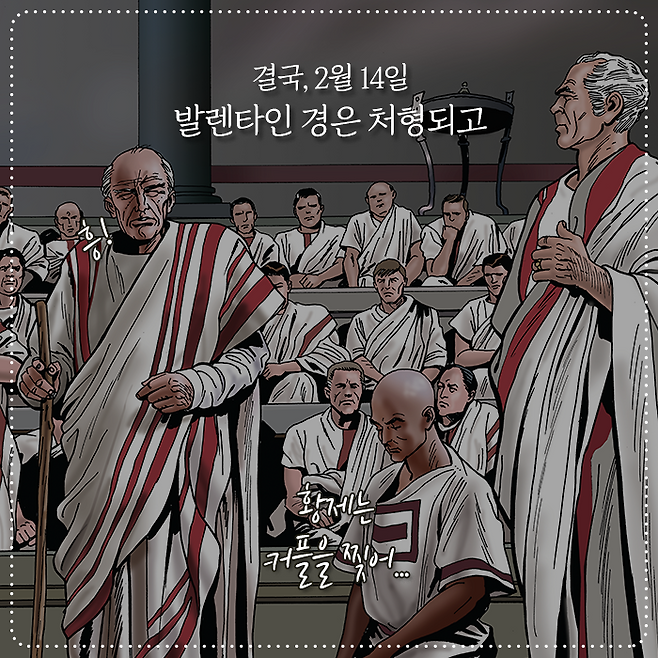 자신의 허락 없이 결혼을 시켰다는 사실에 분노한 황제는 발렌타인 경을 처형합니다. 황제의 말이 곧 법이었던 시대, 발렌타인 경은 연인의 사랑을 허락했다는 죄로 순교하고 말죠. 이후, 사람들은 발렌타인 경이 순교한 날인 2월 14일을 축일로 지정하고 해마다 연인들의 사랑을 기념해왔습니다.