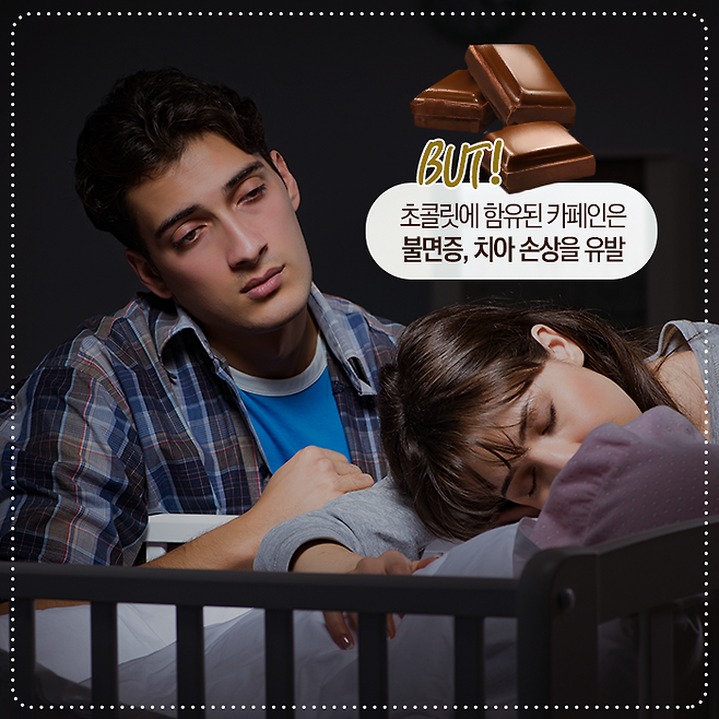 초콜릿에 함유된 카페인은 두근거림이나 수면 장애를 유발할 수 있다고 해요. 또한, 초콜릿의 당분은 충치 유발 위험이 있고 치아를 누렇게 만들기도 한답니다!