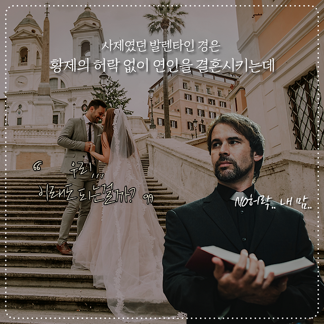 성당의 사제였던 '발렌타인' 경은 이를 안타깝게 여겼습니다. 그래서, 황제 몰래 연인의 결혼을 성사시키고 마는데요. 아무도 모르게, 비밀스러운 장소에서 결혼식을 올렸지만 세상에 완벽한 비밀은 없는 법. 결국 황제가 이 사실을 알게 됩니다.