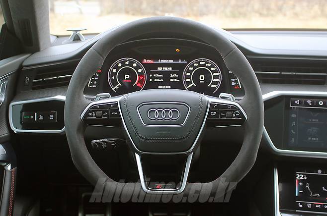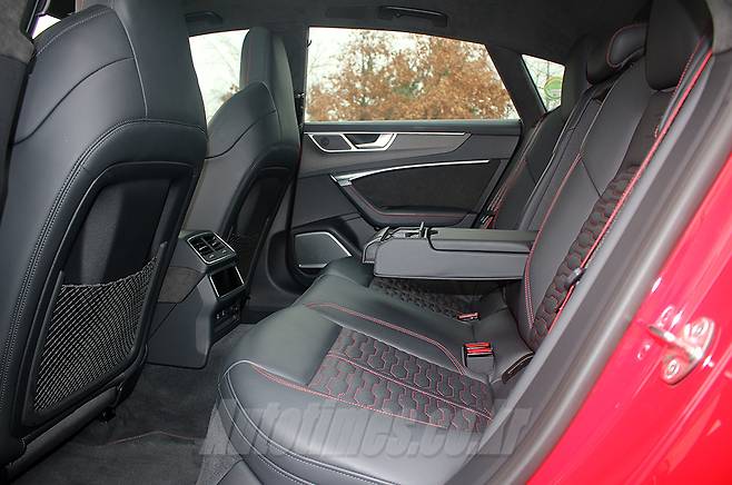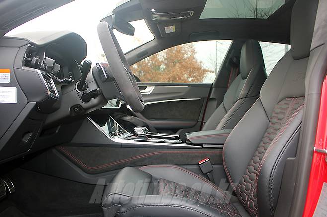 실내는 아우디 중형 세단의 레이아웃을 그대로 간직했다. 여러 소재로 겹겹이 쌓아 올린 듯한 대시보드는 기하학적인 조형미로 첨단의 이미지를 구현했다. 디지털 기반의 계기반과 콕핏, 센터페시아를 가득 채운 듀얼 스크린과 인포테인먼트 등도 미래적인 느낌을 강조한다. 그러나 곳곳에 활용한 알칸타라와 나파 가죽, 버킷 형태의 시트, 빨간 바느질 마감 등 RS만의 핫 소스를 버무려 고성능 본연의 성격도 잘 드러냈다.