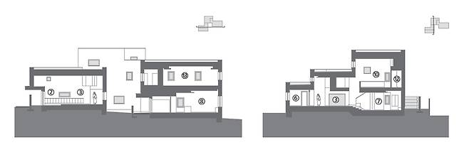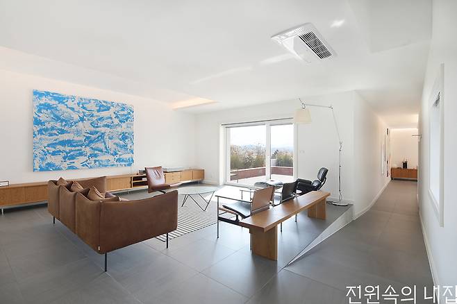 내부 조닝은 작은 여행을 하듯 각 실이 짜임새 있게 전개되었다. 낮은 처마 밑 현관을 통해 집 안에 들어서면 먼저 높은 천장을 가진 복도를 만난다. 그다음으로 액자에 담긴 그림 같은 원경과 근경을 고려한 창들을 지나면 2층이 짐작되는 높고 입체적인 공간이 펼쳐지고, 단차와 바닥재로 구분된 거실과 계단실의 기로에 서게 된다. 두 단쯤 아래로 내려간 거실에는 건축주의 취향이 드러나는 아트피스와 가구가 놓여있다. 그리고, 또다시 나지막한 램프를 따라 걸어 들어가면 새로운 풍경의 주방 및 다이닝룸이 나타나는 시퀀스를 갖는다.
