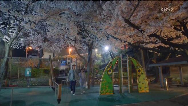평범한 놀이터에 이렇게 벚꽃이 흐드러지게 필 수가. 단조로운 일상에 한 줄기 빛과 같았던 ‘쌈 마이웨이’의 벚꽃 장면은 평범해서 더욱 아름다운 장면. 김지원이 박서준을 위로해주는 마지막 장면은 김지원에게 반할 수밖에 없는 심쿵 장면. 놀이터에서 박서준의 자존감을 높여주며 서로에게 힘이 되어주는 대사를 하는 도중 별 만큼이나 환하게 보이는 벚꽃은 장면을 더욱 아름답게 만들어주었다. 특별하지는 않지만, 곧 벚꽃이 피는 계절에는 서로 힘이 될 누군가와 근처 놀이터에서 벚꽃 구경을 해도 되겠다.