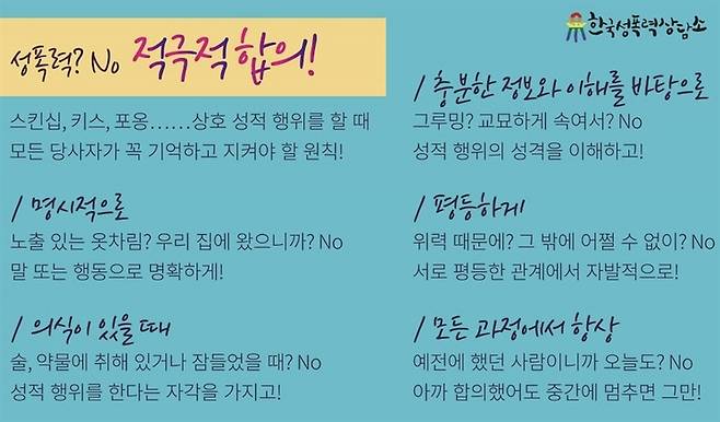| ▲ 한국성폭력상담소는 성폭력 피해생존자들을 지원하며, 모든 성적 관계가 적극적 합의를 바탕으로 이뤄져야 함을 역설했다. 한국성폭력상담소가 정의한 '적극적 합의'는 다음과 같다. |