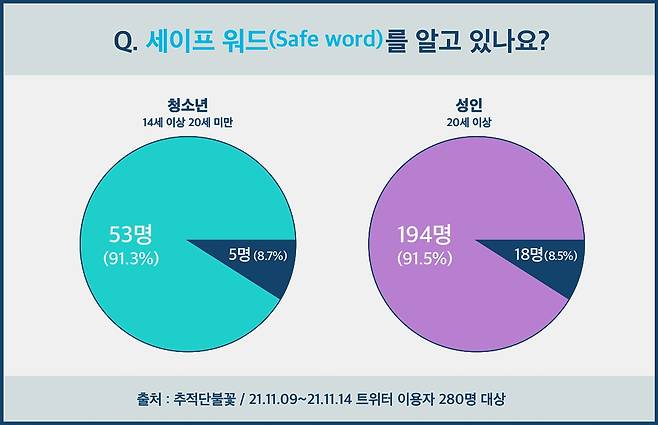 | ▲ 추적단 불꽃은 SSC 관련 인식도를 알아보기 위해, 특히 BDSM을 자극적으로 전시하고 있는 SNS인 트위터 이용자들을 대상으로 설문조사 <온라인 성 문화 조사 : BDSM 문화를 중심으로>(전체 응답자 총 280명, 응답 기간: 21.11.09.~21.11.14.)를 진행했다. |