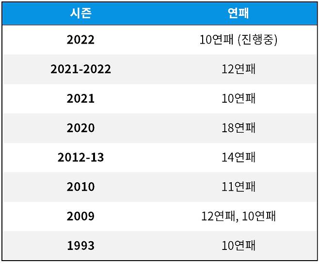 한 시즌 10연패 이상 두 차례