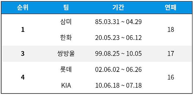 먼저 2020시즌 기록한 최다 연패인 18연패 기록 입니다. 1985년 기록한 삼미와 함께 공동 1위를 기록하고 있습니다.