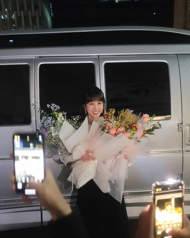사진 속 그녀는 팬들이 전해준 선물과 꽃다발을 들고 활짝 미소를 지으며 감사의 마음을 전했습니다.