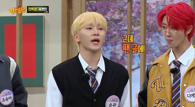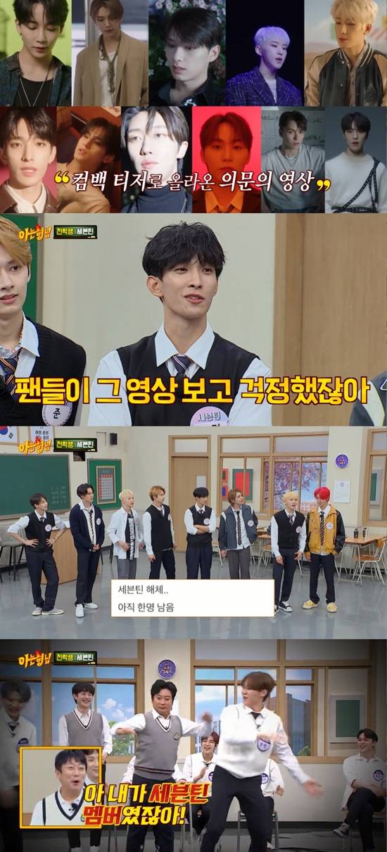 이에 팬들은 해체, 탈퇴를 걱정하기도 했다고. 승관은 "세븐틴 해체하는데 아직 한 명 남았다는 글이 있다"라며 팬이 작성한 게시글을 언급했다. 게시글에는 지난 방송에서 세븐틴 열네 번째 멤버로 활약한 이수근의 영상이 포함돼 웃음을 자아냈다.