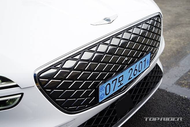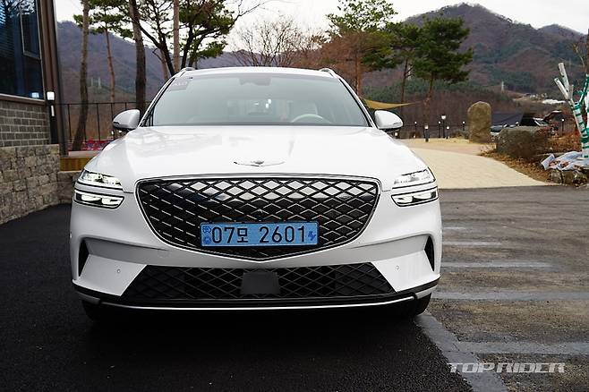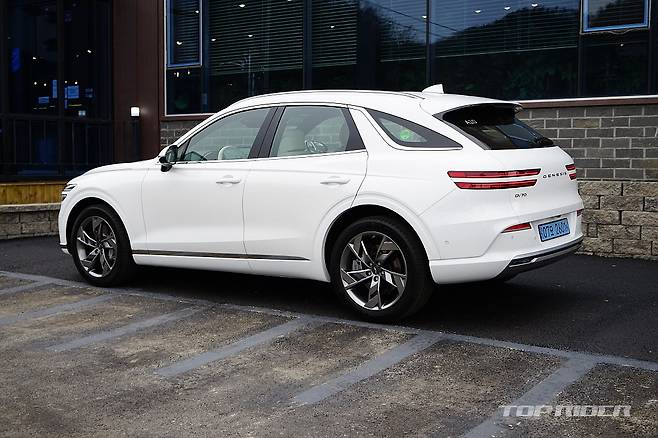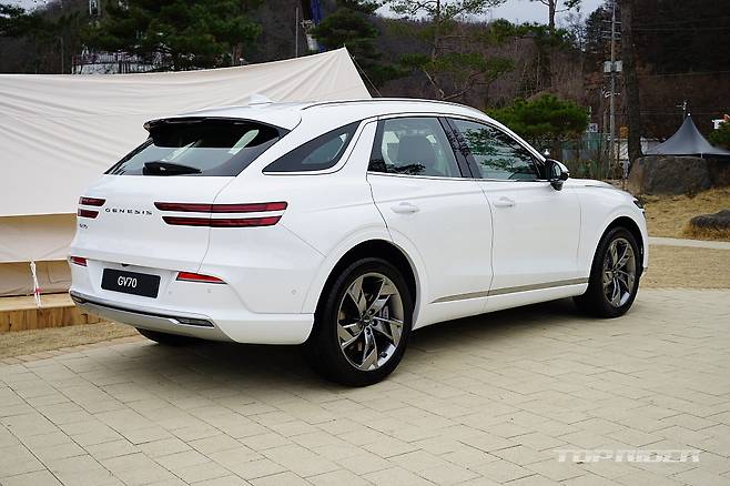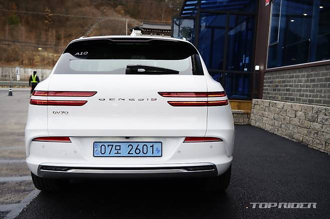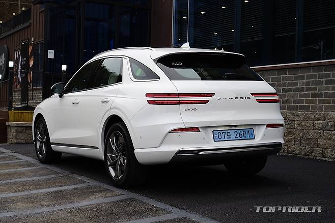 GV70 전기차의 외관은 내연기관 GV70와 큰 차이가 없다. 전체 라인업의 전동화를 계획한 상황에서 어쩌면 당연한 선택인데, 대표적으로 구분되는 디자인은 내연기관차의 특징인 전면부 그릴의 변화와 후면부 배기구의 삭제, 다른 형태의 신규 휠 디자인 정도에서 그친다.