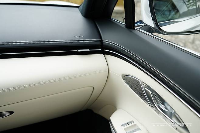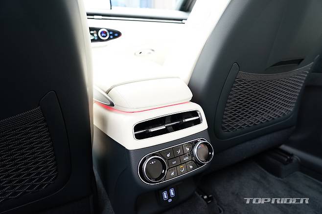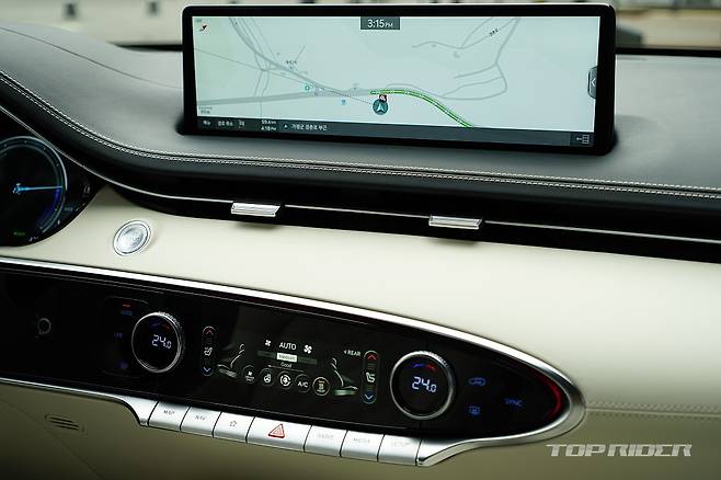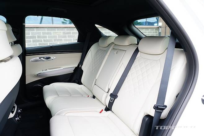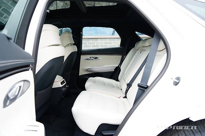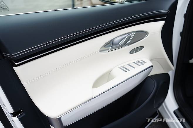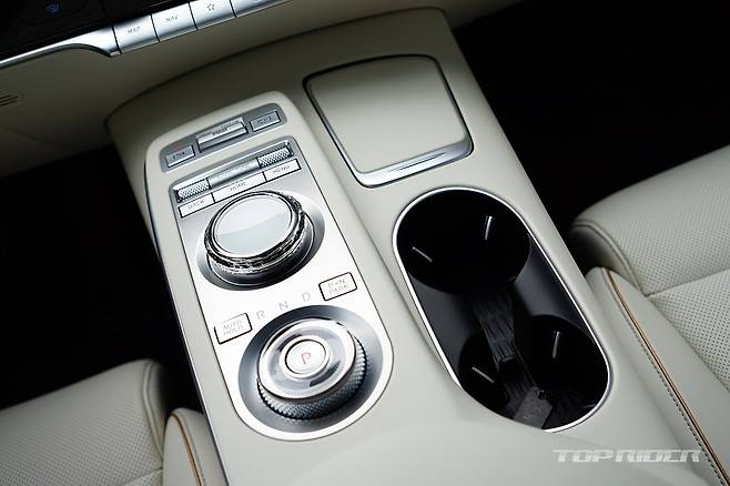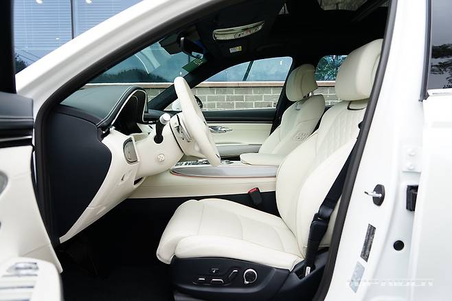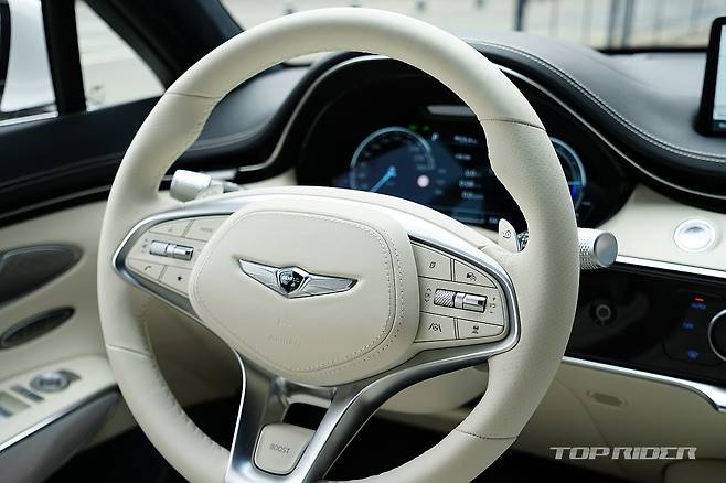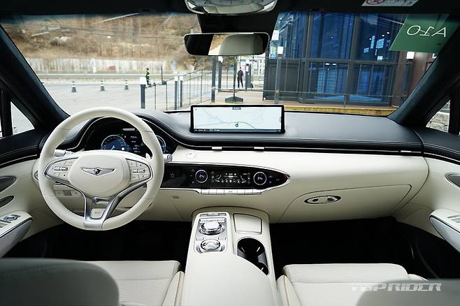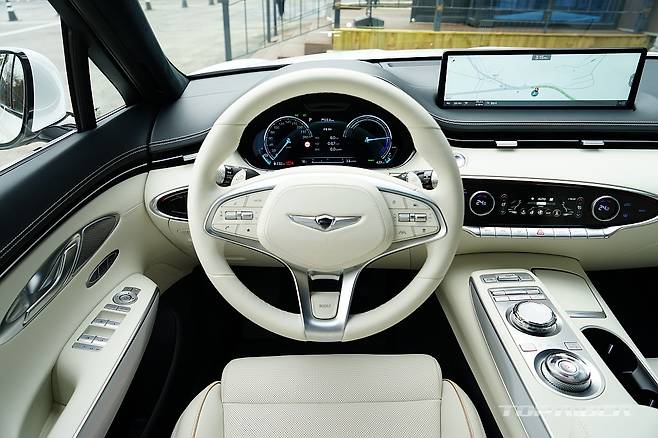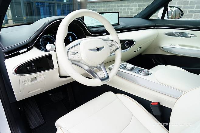 실내는 화사한 색감의 화이트 컬러로 구성돼 고급감이 돋보인다. 스티어링 휠은 GV70 스포츠의 3-스포크 형태를 기반으로 하이그로시가 아닌 일반적인 물리버튼이 적용됐는데, 이 부분의 디자인이 고급스럽게 다가온다. 도어와 대시보드의 가죽 마감은 포르쉐가 연상된다.