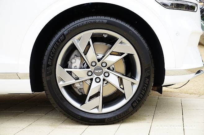 굽은 길에서는 퍼포먼스 대비 타이어 그립이 다소 부족한데, 무게는 늘어나고 타이어는 그립이 줄어든 모델을 사용했기 때문이다. 본격 스포츠 주행시에는 하이그립 타이어로의 교체를 추천한다. 타이어 규격은 GV70 내연기관 보다 넓은 전후 265/45R20을 사용한다.