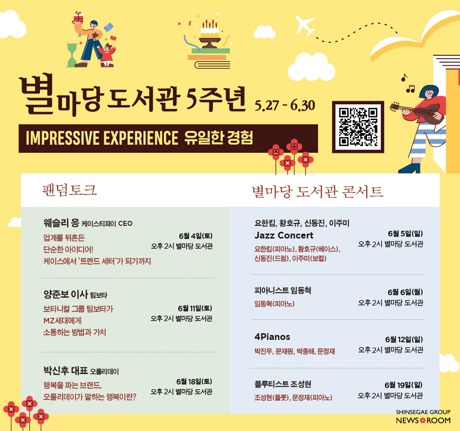 이번 강연은 시작일 뿐이다. 오징어 게임의 황동혁 영화감독, 경희대학교 물리학과 김상욱 교수, 송승환 예술감독 등 자신만의 분야를 개척해 길을 닦아 온 명사들의 ‘명사 초청 특강’, 데드풀의 황석희 번역가, 동국대 경찰사법대학원 권일용 교수 등을 초청해 최신 트렌드와 이슈를 다루는 ‘컬처 클럽’, 케이스티파이, 팀보타, 오롤리데이 등 탄탄한 팬덤을 보유한 브랜드들의 ‘팬덤 토크’등이 6월 한 달 내내 이어질 예정이다. 별마당 도서관을 아름다운 선율로 가득 채울 콘서트도 준비했다. 임동혁 피아니스트부터 황호규(베이스)•요한킴(재즈피아노) 등으로 구성된 재즈 콰르텟, 문정재•박진우•문재원•박종해 4명의 피아니스트로 구성된 4 Pianos & 8 Hands 등의 쟁쟁한 라인업이 눈길을 끈다. 신세계프라퍼티 마케팅팀 이상원 파트너는 “오랫동안 그리던 일상이 다시 찾아오는 시기인 만큼 고객들이 더욱 다채로운 경험을 할 수 있게 콘텐츠를 구성했다”고 말했다.