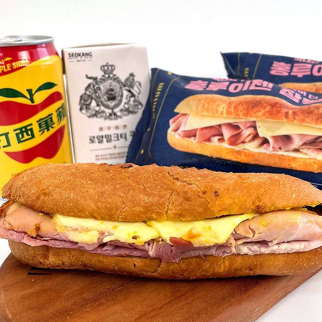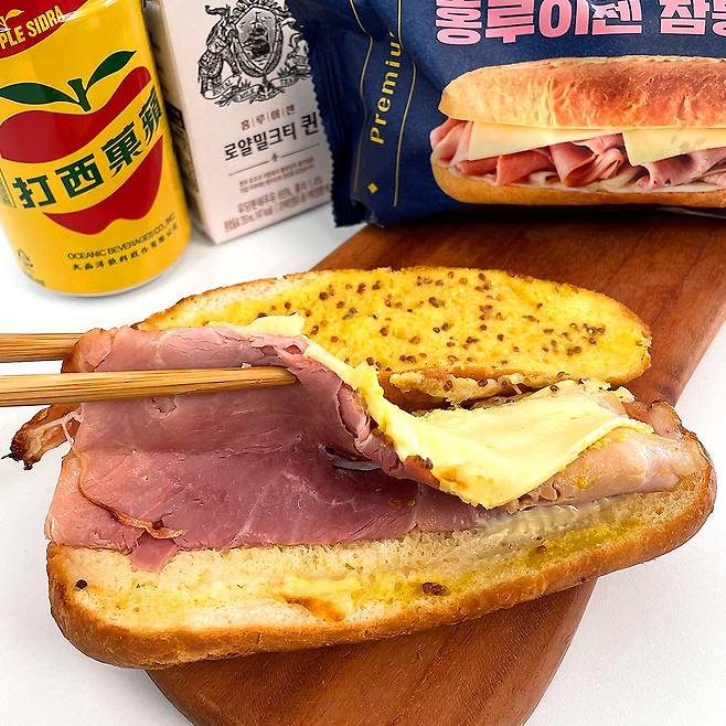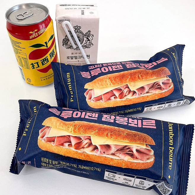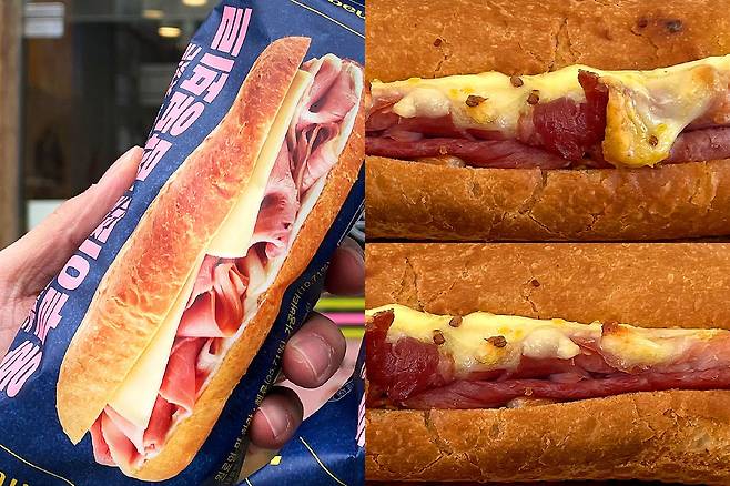 매장에 도착하자마자 엄청난 비주얼로 유혹하는 잠봉뵈르 포장 ㅋㅋㅋ 가격은 하나당 5,500원이었는데 기존 홍루이젠에서 판매하던 샌드위치가 비싸도 3,000원대인걸 생각하면 좀 많이 비싼 느낌이었어요..! 만약 포장지에서 꺼냈을 때도 저렇게 생겼다면 가격은 크게 문제가 안될 것 같은데..