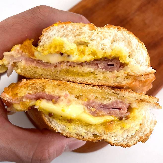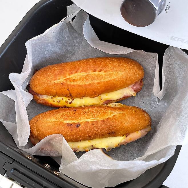 그래도 맛은 맛있겠지 하며 냉동상태인 잠봉뵈르를 해동한 다음, 에어프라이기로 180ºC에서 7분 이상 데워주었더니 냄새부터 고소~한 게 나쁘지 않더라구요?