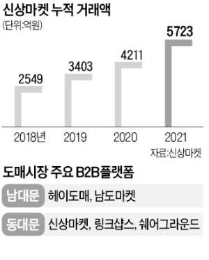 의류를 주로 취급하는 신상마켓의 경우 거래액이 2018년 2549억원에서 지난해 5723억원으로 124.5% 불어났다. 동대문 전체 도매점포 1만1000곳 가운데 80%가 이 서비스를 이용 중이다. 패션 잡화를 다루는 헤이도매는 남대문 매장 1200여 개 중 320여 곳이 활용하고 있다.