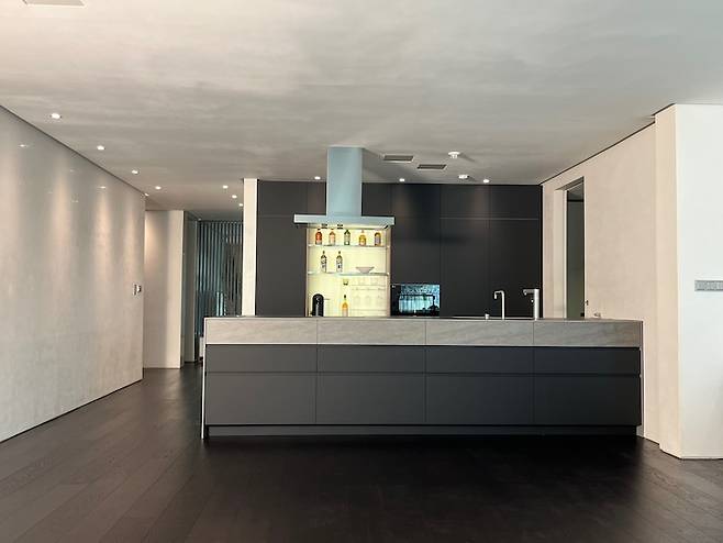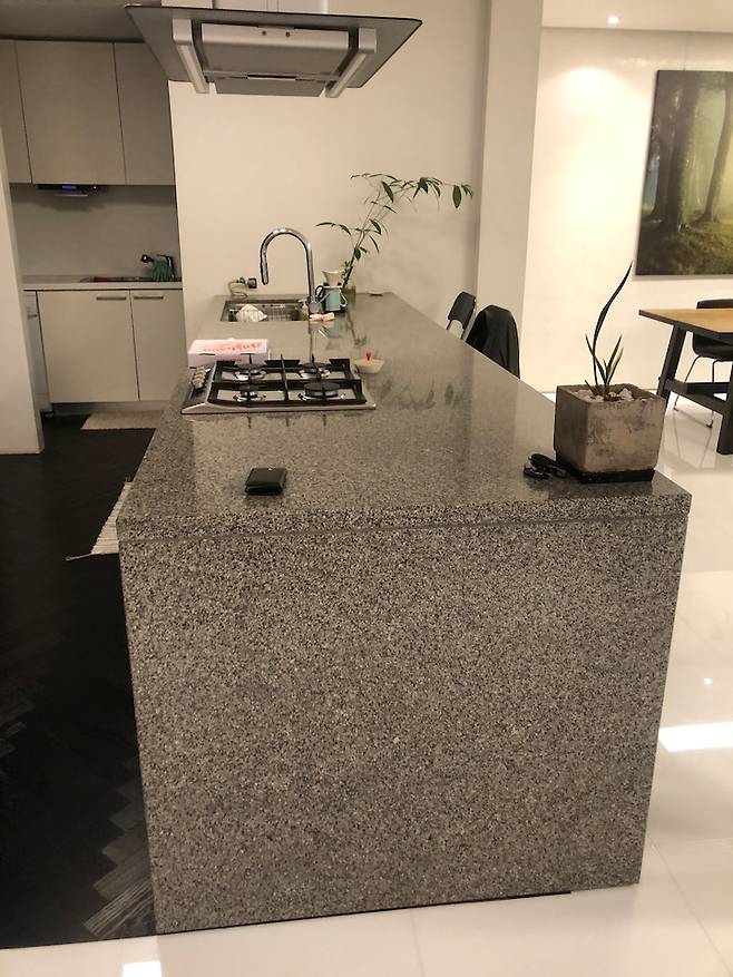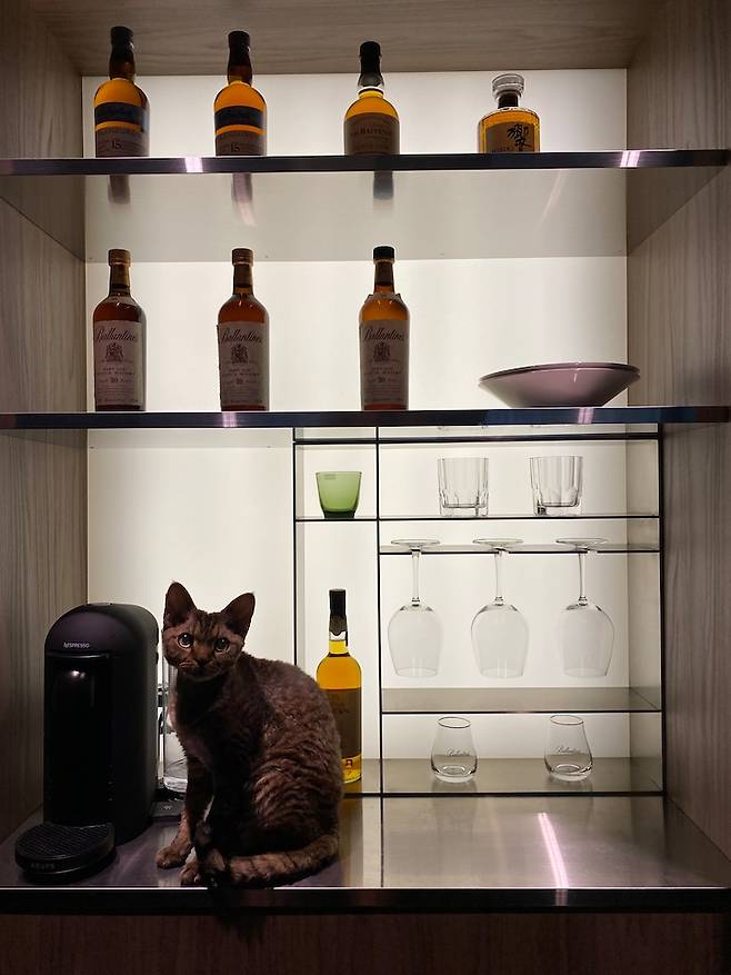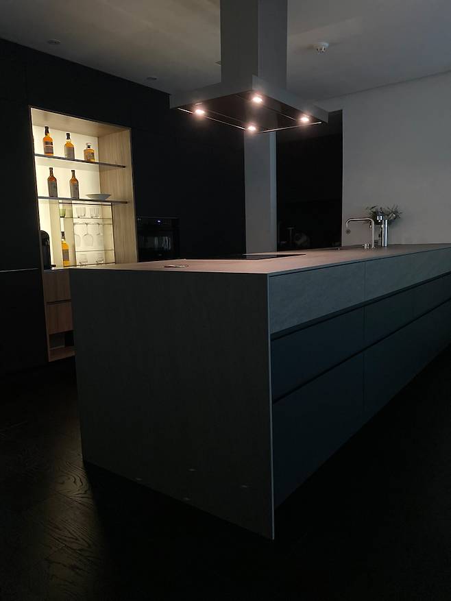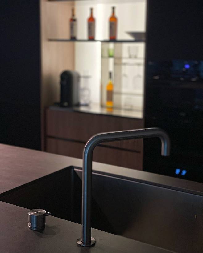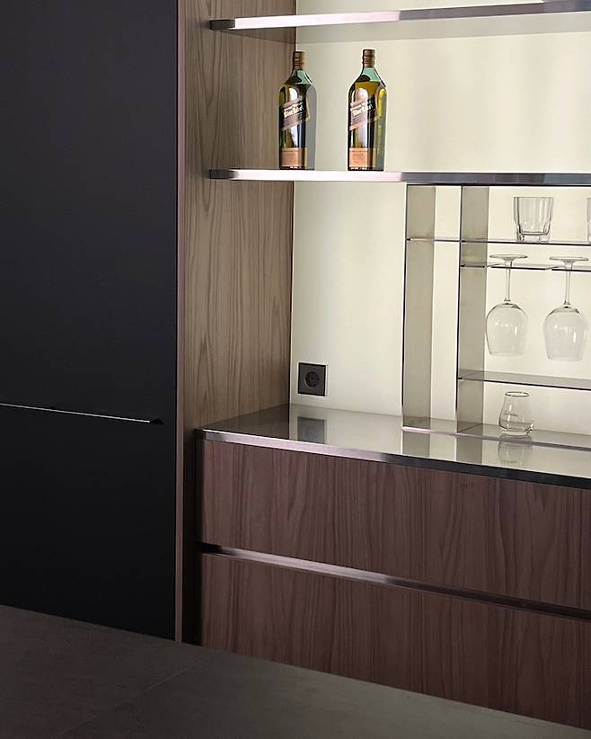 위스키를 놓을 진열장과 호텔의 미니바같이 커피 머신을 놓을 수 있는 공간을 갖고 싶었어요. 저희의 로망을 실현시켜줄 모던하고 고급스러운 디자인이 가능한 시공업체를 열심히 찾았습니다. 이사 오고 한참 후에나 주방 공사를 시작해서 두 번 이사하는 느낌이었지만, 결과적으로는 너무 만족스러워요.