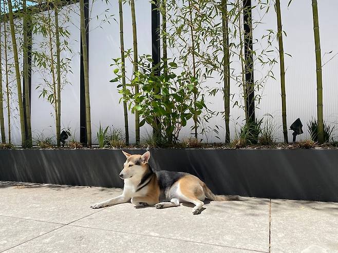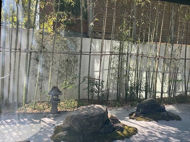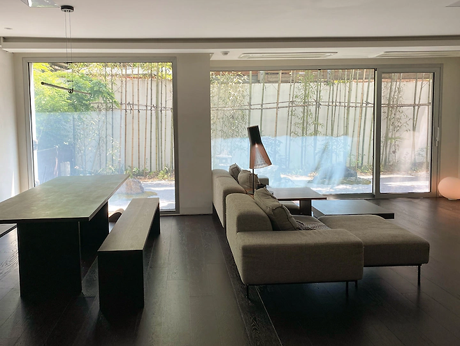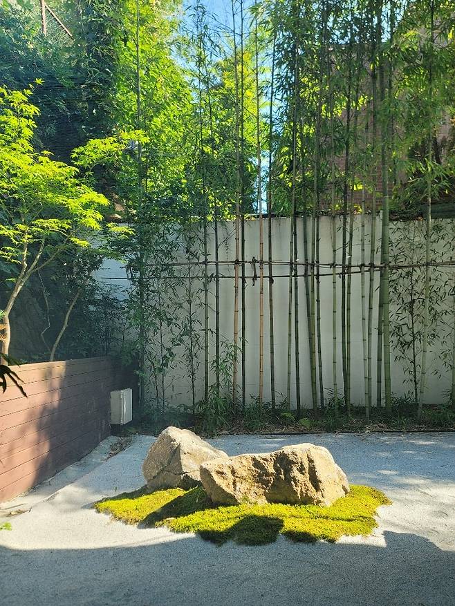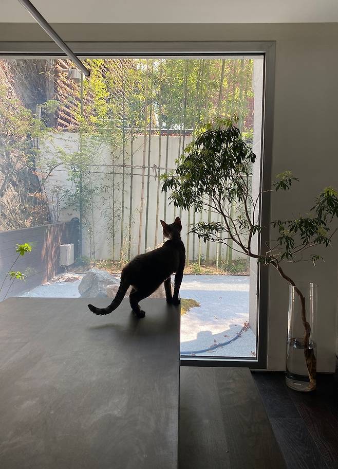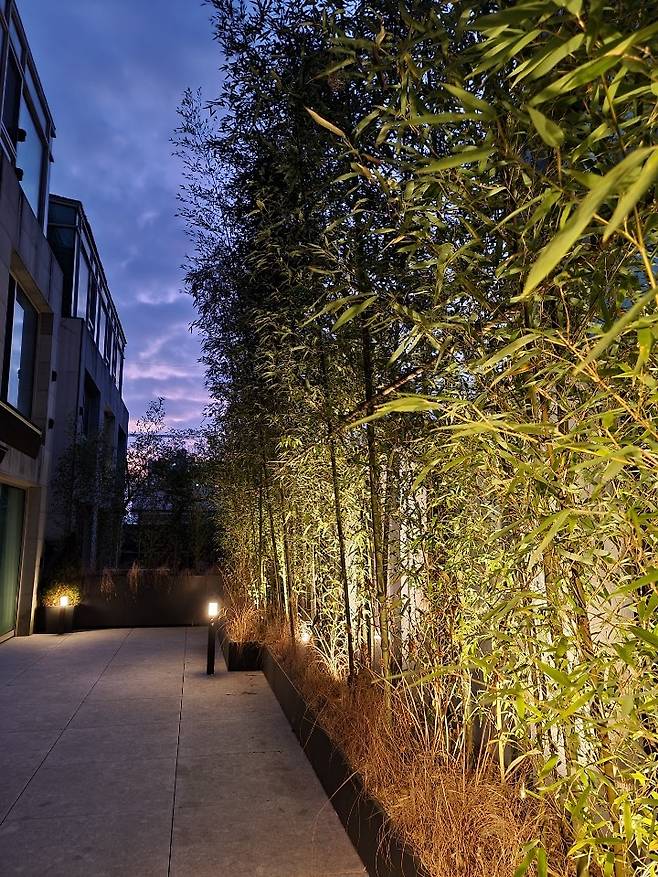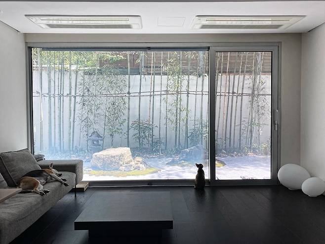 조경할 때 도면 단계에서 저희가 식물을 잘 돌보지 못할 수도 있으니 신경을 너무 많이 쓰지 않아도 되면서 기르기 좋은 대나무를 선택하게 되었어요. 바닥은 청소하기 좋게 대리석으로 마감했습니다.