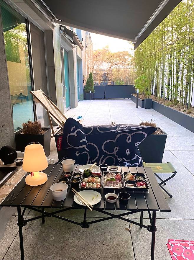 야외에 나가면 편하게 쉬고 누워서 책도 읽고 싶어서 빈백을 찾았는데, 생각보다 마음에 드는 야외 가구 파는 데가 많지 않더라고요. 다행이 근처에서 야외 가구를 파는 편집숍을 찾아서 그곳에서 빈백과 야외조명을 구입해 꾸며보았어요.