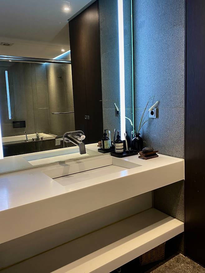 메인 침실 안에는 욕실과 작은 드레스룸 공간이 있어요. 욕실은 따로 공사를 하지 않고 이사 왔을 떄와 똑같습니다. 기존 디자인이 대리석의 묵직한 스타일인데 그 나름의 멋이 좋아서 그대로 사용 중입니다.