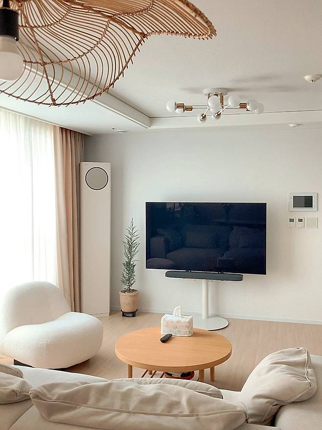 가장 먼저 소개할 곳은 거실이에요. 저희 부부가 넷플릭스로 영화를 보거나 유튜브로 홈트를 하는 곳이죠. 가장 많은 시간을 보내는 공간인 만큼 편안하고 아늑한 느낌으로 꾸미려고 했어요.