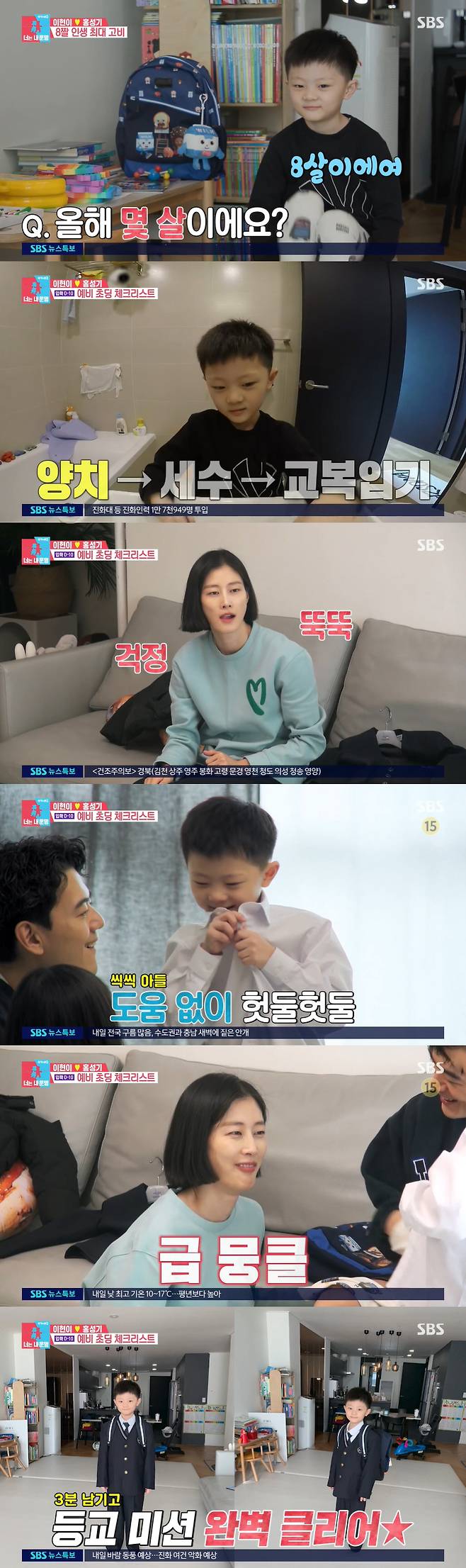 아빠의 첫 미션은 20분 안에 세수, 양치, 교복 입기까지 등교 준비하기. 이때 도와주려 안절부절하던 이현이는 혼자서도 척척해내는 아들의 모습에 "윤서 많이 컸구나"라며 눈물을 글썽였다.