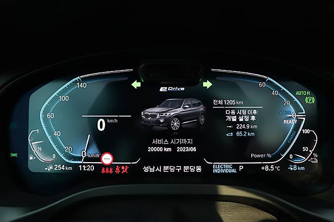 스티어링 휠 안쪽에 12.3인치 계기판은 PHEV 전용으로 전기모터의 성능 정보와 배터리 잔량, EV 모드와 복합 모드의 주행가능 거리 등을 표시해 준다. 이를 통합해 OS 7.0 & Mixed Reality라고 표현한다. 등장한 지 제법 시간이 지났지만, 여전히 신선하다. BMW를 처음 접한 오너라고 해도 크게 위화감을 느끼지 않고 익숙해지는 데 시간이 필요하지 않을 것 같은 그래픽이다. 계기판에 앞쪽을 달리고 있는 차량이 그림으로 표시되는 것도 달라진 부분이다.