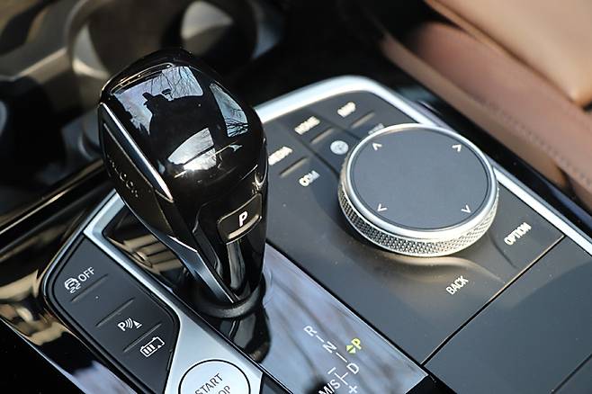 iDrive의 컨트롤 패널과 스위치 패널은 그대로인데 그 안의 내용이 달라졌다. 시동 버튼이 스티어링 칼럼 오른쪽에서 이 부분으로 옮겨온 것도 보인다. iDrive의 컨트롤러도 신세대로 바뀌었고 실렉터 레버 주변의 주행모드 버튼이 추가됐다. 그중에서 시동 버튼 앞에 설치된 배터리 컨트롤 모드가 새롭다. 배터리가 필요한 상황에 대비하기 위해 운행 중 배터리를 충전하는 모드로 30~100%까지 충전을 조절할 수 있다.
