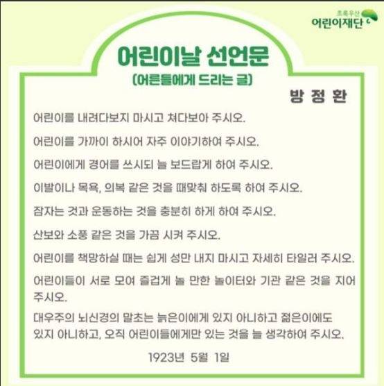 5월 16일 방영된 EBS 다큐 프라임에서는 대한민국 아동 100년의 시간을 조망했다. 백 원이던 과자가 천오백 원이 되었다며 속상해하는 아이들, 이제 그 아이들은 '어린이날'을 만든 방정환 선생님을 모르는 세대가 되었다. 대신, 유튜브에서 초등학생들을 '잼민이'라고 비하한다며 불쾌해한다. 어린이가 '잼민이'가 된 세상, 과연 방정환 선생님이 '나라의 자원'이 되어야 한다며 소중하게 여기라 했던 어린이는 존중받고 있을까?