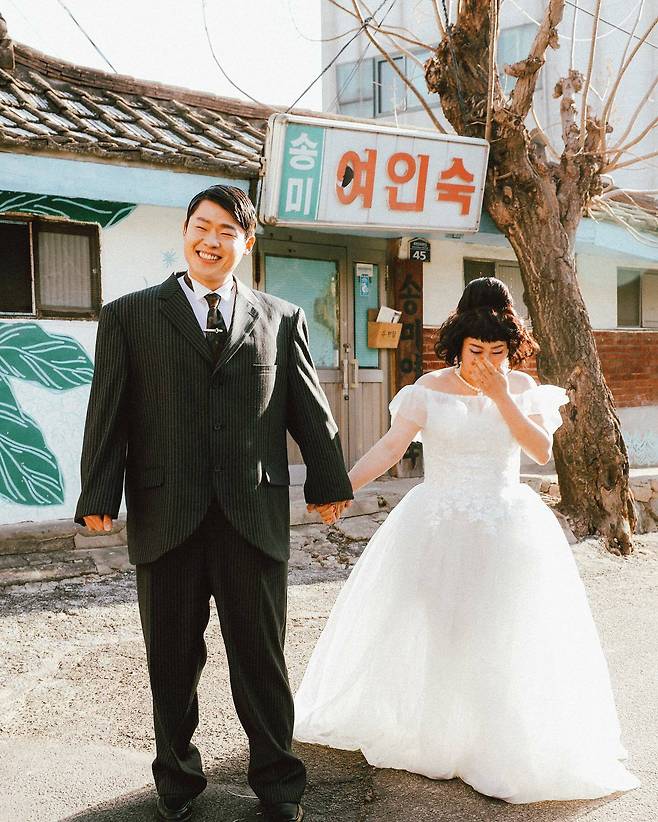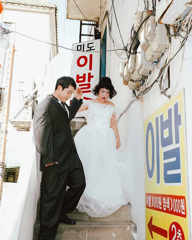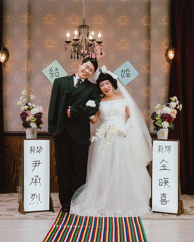 김영희와 윤승열은 마치 1970년대 결혼식을 보는 듯한 레트로 콘셉트의 웨딩 화보를 촬영했습니다.