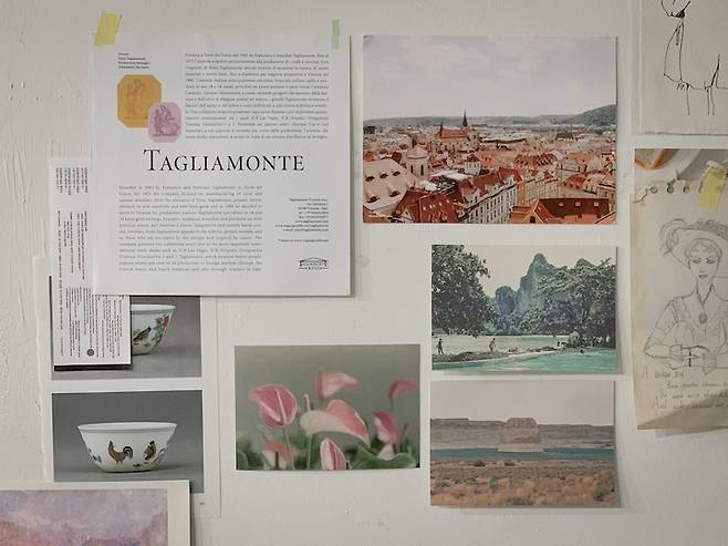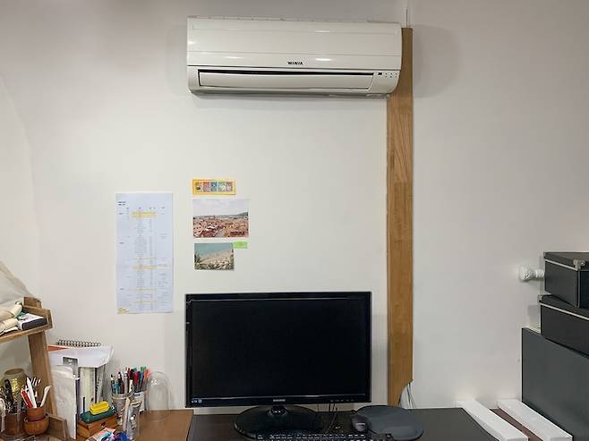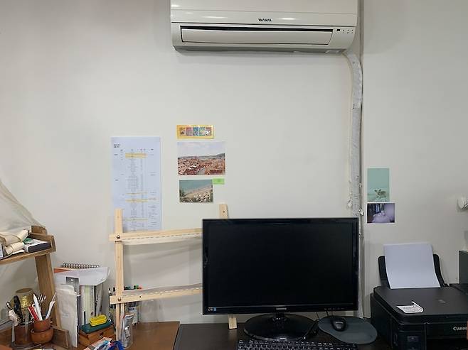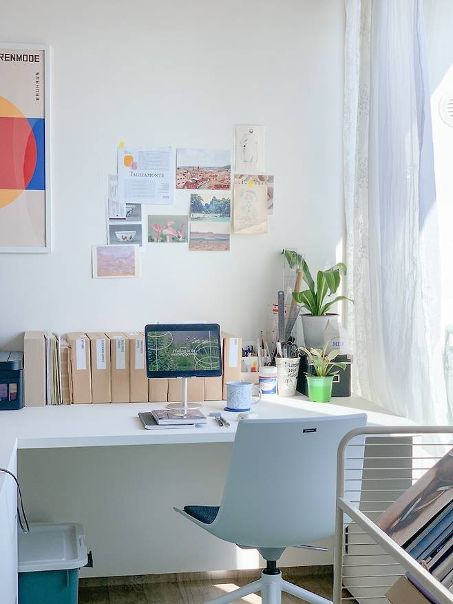 벽은 제가 좋아하는 그림과 엽서로 꾸며두었어요. 전시회에서 구매한 도록이나 스크랩한 잡지, 엽서, 혹은 직접 그린 그림 등으로 꾸며주고 있습니다. 지금은 여행 가고 싶은 마음이 걸려 있어요.