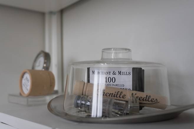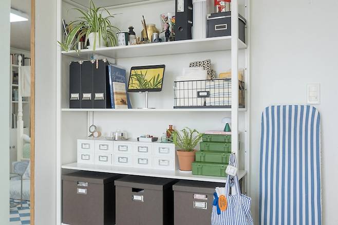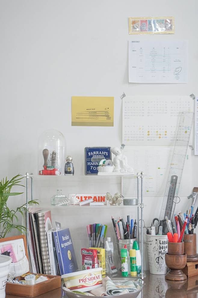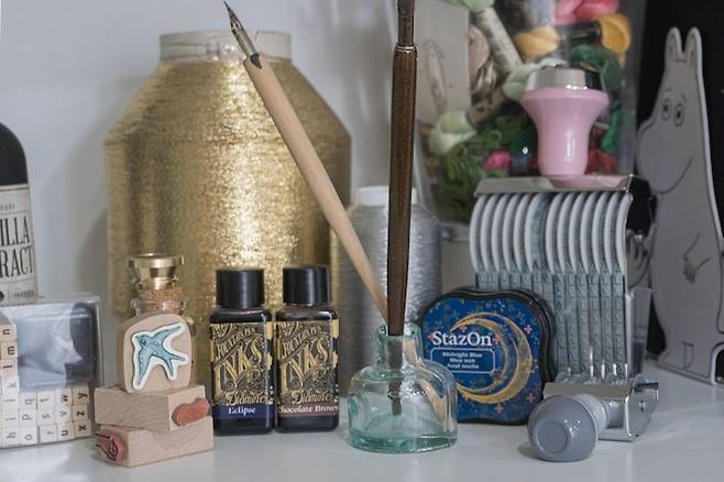 책상에 다 올려두지 못한 소품들은 선반에 늘어두고 있지요. 바느질 용품도 있고, 스탬프나 잉크 같은 문구류도 있어요.