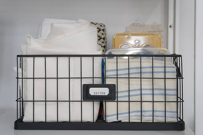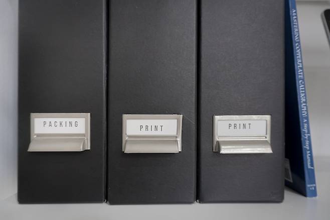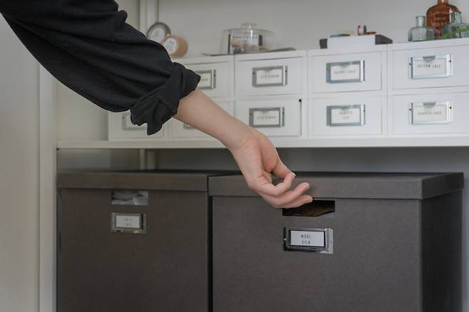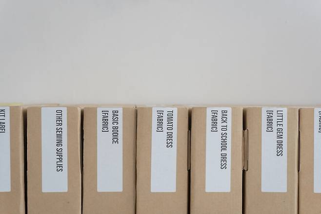 원단 박스로 사용하고 있는 커다란 종이 박스. 이케아에서 구매한 박스에 금속 명찰을 구입해서 따로 달아주었어요. 금속 명찰 꽂이는 종이보다 내구성도 좋고, 박스 자체를 더 견고한 제품처럼 보이게 해줘서 만족스러워요.