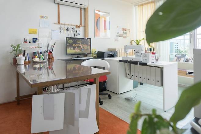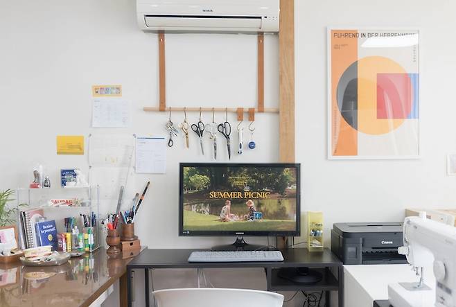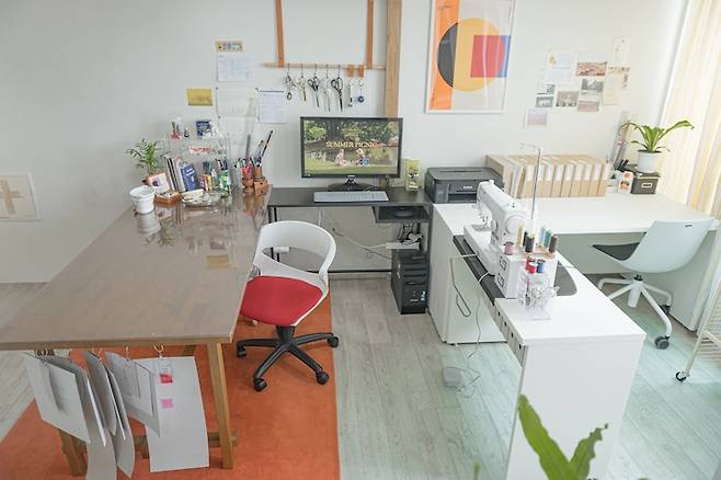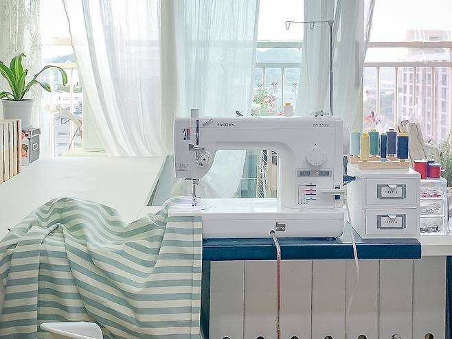 작업 테이블 옆에는 컴퓨터 책상과 재봉틀 책상을 ㄷ자 형태로 붙여두었어요. 요 자리에서 몸만 쇽쇽 돌리면 작업 테이블과 컴퓨터, 재봉틀까지 3개 책상을 전부 이용할 수 있습니다.