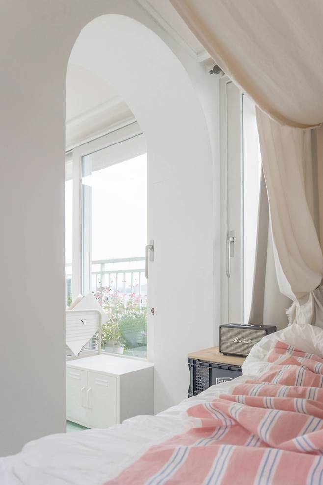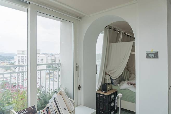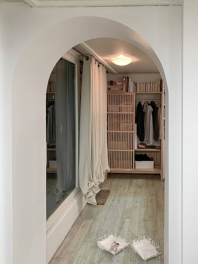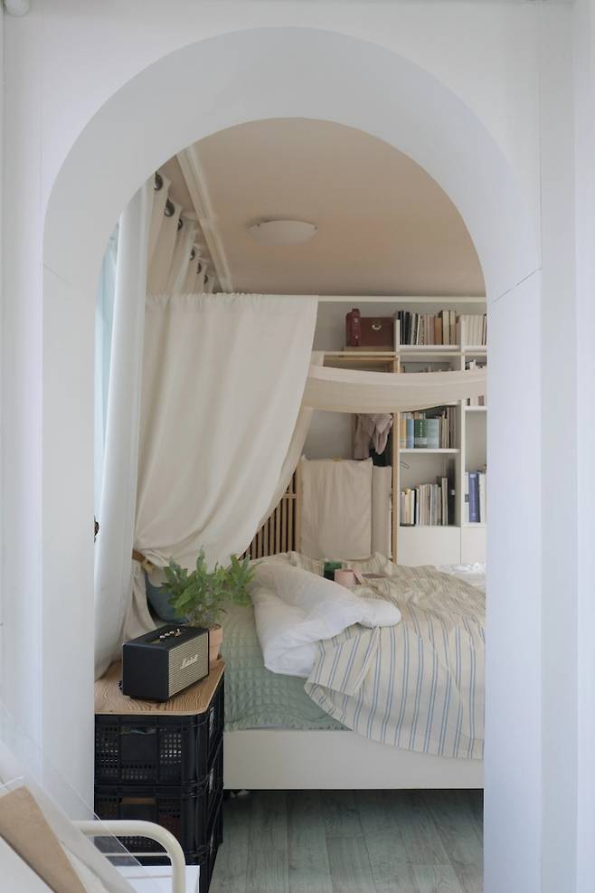 침대에서 바라본 풍경이에요. 아치 문이 시야를 터주면서 공간 구분용으로 배치한 수납장들이 적당한 높이로 막아주어 독립된 공간으로 느껴져요.
