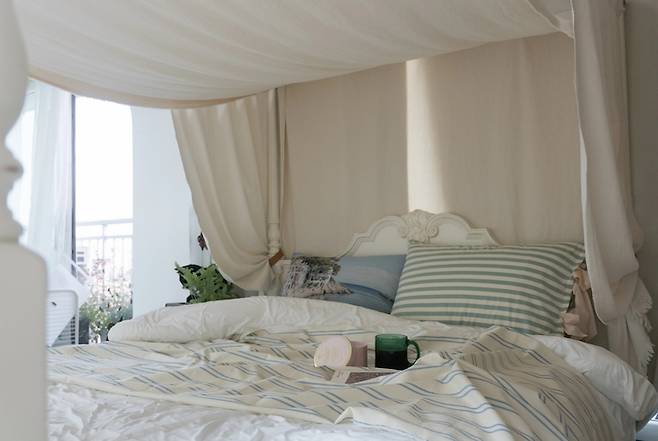 침대는 어려서부터 사용하던 캐노피 침대예요. 엄마의 취향이 담긴 커다란 사이즈의 공주님 침대 ㅎㅎ 어렸을 때는 레이스 커튼에 프릴이 달린 굉장한 침대였는데 지금은 제 취향을 더해 조금 중화시켜주었습니다.