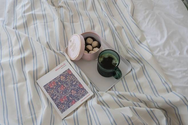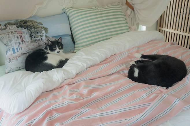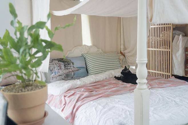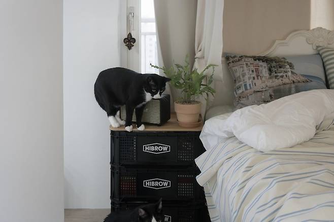 부지런한 편은 못 되어서 침구 전체를 자주 교체하지는 못하지만 위에 담요만 바꾸어 기분전환을 하곤 합니다. 담요나 베개 커버 정도만 바꿔도 분위기가 꽤 달라지더라구요. 간단해서 좋아하는 방법이에요. 집에 고양이들이 많다 보니 이불은 알러지 케어 제품을 사용하고 있어요. 알러지 케어라 안심되고 고밀도 원단이라 이불에 털이 박히지 않아 청소할 때도 비교적 수월한 편입니다.