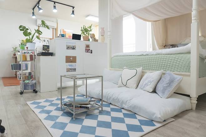 침대 앞에 마련된 좌식 공간이라 업무 공간에서는 잘 보이지 않아요. 수납장으로 둘러싸여 있어 좀 더 아늑한 느낌이 듭니다. 아지트에는 더프리그의 다이아몬드 패턴 러그를 깔아주었어요. 보기만 해도 산뜻해지는 하늘색이 볼수록 매력적이에요.