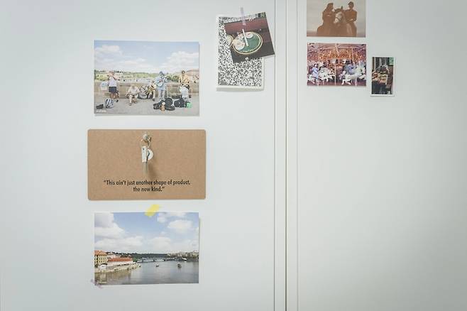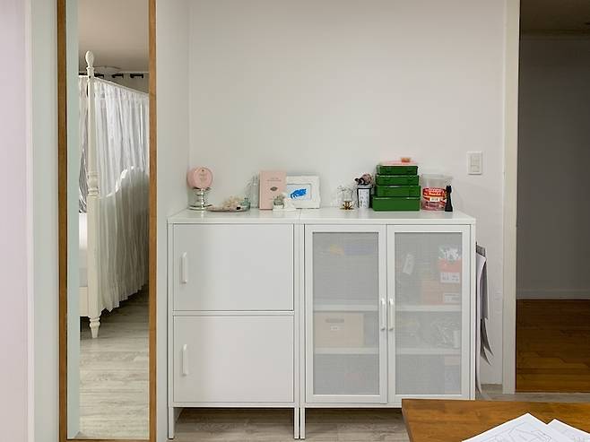 수납장 뒤쪽은 엽서와 사진을 이용해 꾸며주었어요. 좋아하는 사진을 더하니 더 아지트 같은 느낌!