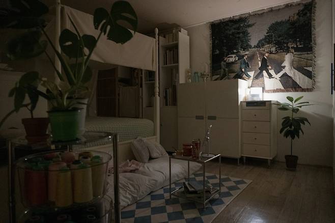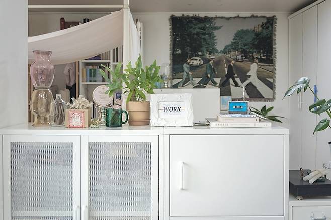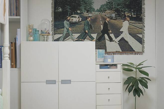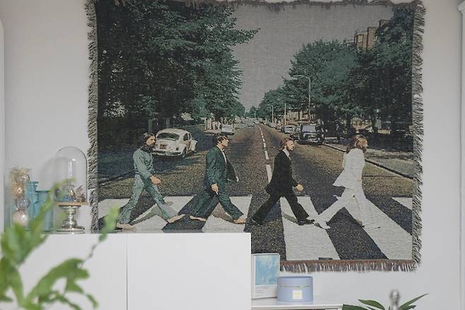 아지트와 침실 쪽에는 패브릭 제품을 사용해 아늑한 느낌을 주고 싶었어요. 그중 벽에 걸린 태피스트리는 제 로망 중 하나였는데 아지트를 마련하면서 실현했습니다. 근사한 직조 태피스트리를 걸고 싶었지만 맘에 드는 것들은 가격이 굉장하더라고요. 대신 적당한 러그 제품을 찾아서 벽에 핀으로 고정해두었습니다. 비틀즈의 애비 로드 커버는 언제 봐도 멋져요!