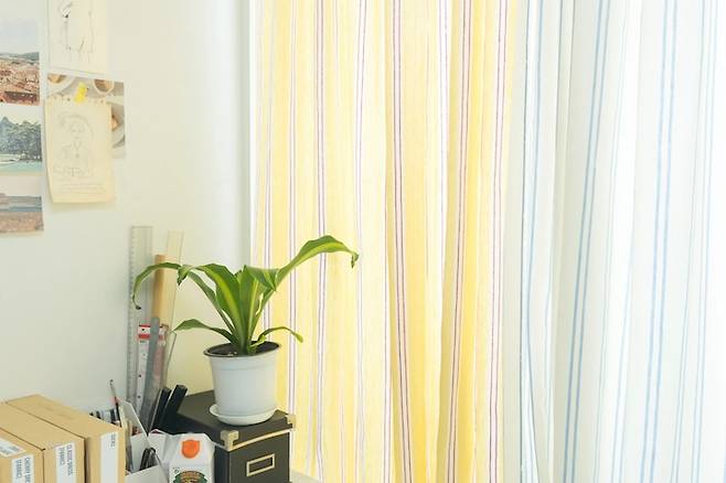 위 사진의 침대보와 여기 흰색 스트라이프 커튼은 같은 원단이랍니다. 이런 홈패브릭은 방 분위기를 바꾸기에도 좋아서 계절 따라, 혹은 기분 따라 바꾸어 주고 있어요. 그간 망설이셨다면 한 번 도전해 보세요.