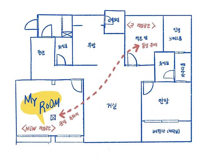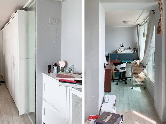 저는 가족들과 함께 아파트에서 생활하고 있습니다. 이 집에서 지낸지는 18년 정도 되어가네요. 증축을 한 45평대의 아파트로 감히 그중 가장 큰 방을 차지하고 있지요. 엣헴! 원래 2개였던 방을 터서 하나로 만든 실평수 8.8평 남짓의 공간이에요. 어릴 때부터 동생과 함께 사용하던 방이지만, 지금은 동생을 작은 방으로 유배 보내고 혼자 쾌적하게 사용하고 있어요.