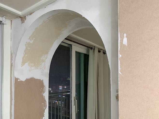 위에서 보셨던 커다란 기둥이에요. 이렇게 아치 형태의 문이 되었습니다. 이 아치를 만드는 2주의 시간 동안 저는 톱질 장인이 되었고요. 가장 싫어했던 기둥은 제법 봐 줄 만한 아치문이 되었습니다. 입체감 있는 아치형 문이 방에 개성을 더하면서 공간 분리도 톡톡히 해내고 있어요.