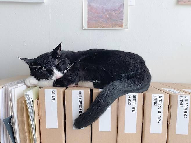 그 건너편에는 간단한 사무업무를 하거나 재봉틀 한 대를 더 둘 수 있는 여분의 책상이 있습니다. 물건을 포장하거나 일정을 정리할 때 주로 이용해요. 볕이 제일 잘 드는 데다 어지를 일이 없어서 이 책상에 앉아 있으면 편안한 마음이 들어요. 냥이들의 낮잠 명당이기도 합니다. 푹신한 자리 놔두고 여길 찾는 이유가 뭘까요.