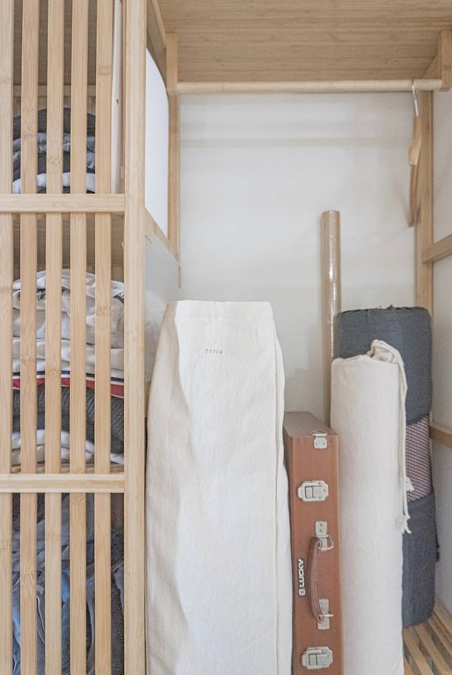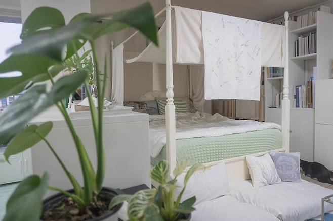 레이스 커튼 대신 캔버스 천을 이용해 휘장처럼 둘러주었어요. 밤낮이 바뀌는 일이 잦기 때문에 볕을 가리기 위해 두꺼운 워싱 캔버스를 선택해 단잠을 지키고 아늑함도 더했습니다.