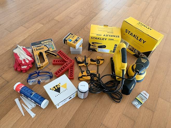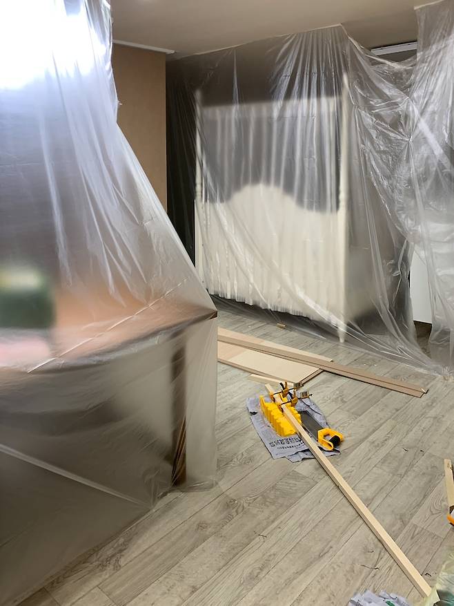 원래는 시공업체를 통해 기둥을 아치문으로 만들려고 했어요. 그런데 말입니다... 유튜브를 봤어요. 정말 그러면 안 됐는데.. 제가 왜 그랬는지 모르겠지만 이상한 자신감이 생겨 셀프 인테리어에 도전하게 되었습니다. 장비부터 각재, 못, 샌딩기 등을 주문하고 막무가내로 시작했어요. 이미 사용 중인 가구들이 있었기 때문에 비닐을 두르고 조금씩 작업했어요. 그때는 무슨 생각으로 그랬는지... 결과가 잘 나와주어서 다행입니다.