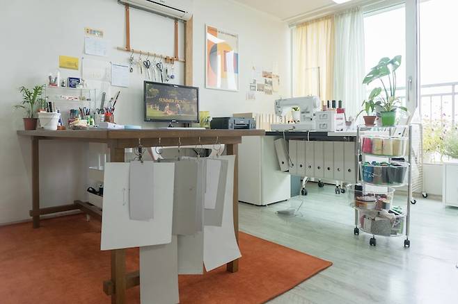 위에서 본 풍경이에요. 책상들이 뒤집어진 F자로 이어져 있어요. 가장 큰 원목 책상은 원단을 재단하고 바느질을 하는 메인 작업 테이블로 사용하고 있어요. 원목 소재와 다리 쉐잎에 반해 구입한 제품이에요. 평소 칼과 가위를 많이 쓰기 때문에 원목 책상을 보호하기 위해 커버를 씌워 사용하고 있습니다. 미관은 조금 아쉬워도 실용성으로는 그만이에요.