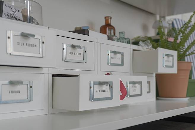 원단과 자잘한 부자재들은 이 선반에 라벨링을 해서 박스와 서랍에 정리해두었습니다. 조금 번거롭지만 라벨링을 해서 정리해두면 물건을 찾기도 쉽고 보기에도 좋더라구요. 이 작은 수납함은 다이소에서 구매했어요. 라벨링을 할 수 있고 원하는 형태로 쌓아 연출할 수 있어서 좋아요. 가격도 저렴한 데다 단정한 생김새가 예뻐서 필요할 때마다 구매한 것이 이만큼 늘어났어요.